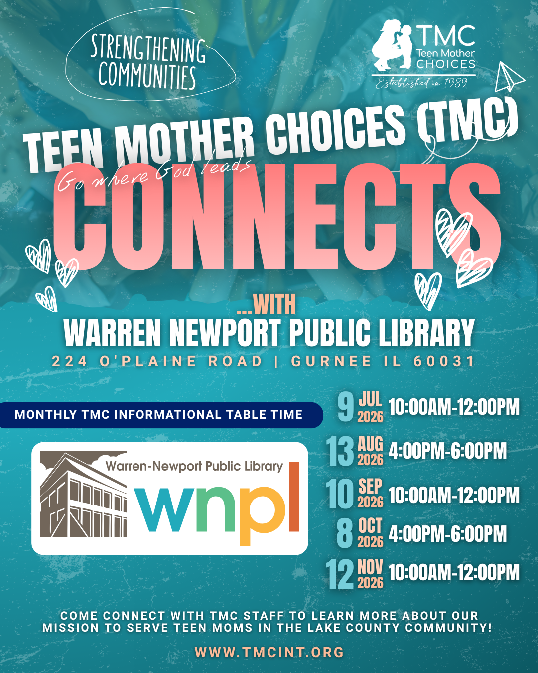 Stop by and connect with us! We’ll be hosting a monthly informational table at Warren-Newport Public Library, beginning in July, to share more about TMC and the programs we offer to support young moms in our community.
