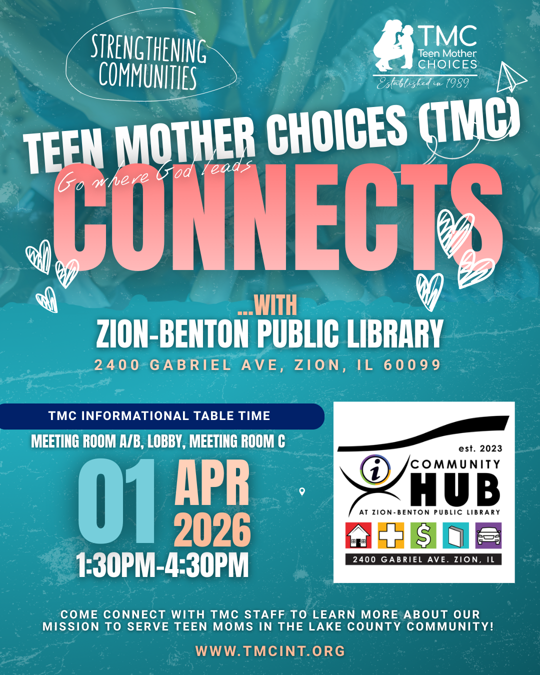 TMC will have an informational table at Zion-Benton Public Library District Community Hub event. The Community Hub brings together organizations that offer support in areas such as housing, employment, health, food assistance, education, and more. Join us on the first Wednesday of every month to explore what’s available and find the tools you need to thrive.